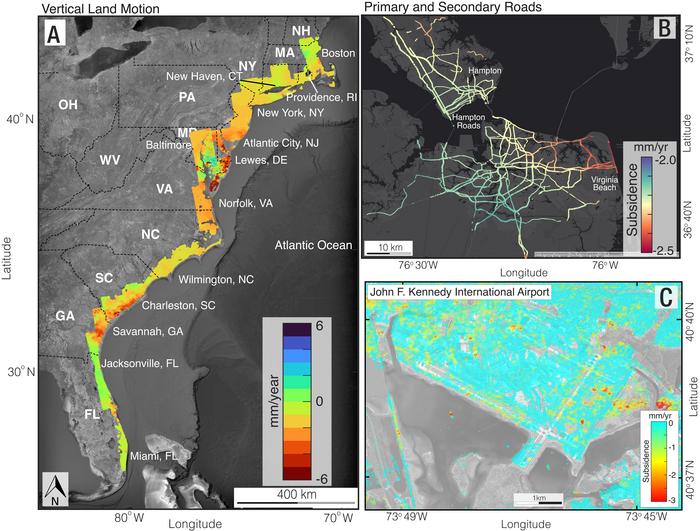 A large area of the U.S. East Coast is sinking. Within that extent, a smaller area of up to 3,700 km2 is sinking more than 5 mm per year. Subsidence can undermine building foundations, damage roads, gas and water lines, cause building collapse, and exacerbate coastal flooding—especially when paired with sea level rise due to climate change. Leonard O. Ohenhen and colleagues used measurements of vertical land motion rates derived from radar satellite datasets to estimate which areas, populations, and infrastructure within 100 km of the U.S. East Coast are at risk of land subsidence. Subsidence rates of 2 mm per year affect up to 2.1 million people and 867,000 properties on the East Coast, with several communities having over 60% of their land area sinking, including Norfolk, VA; Virginia Beach, VA; Baltimore, MD; and Queens, the Bronx, and Long Island in New York City. In these communities, several critical infrastructures such as roads, railways, airports, and levees are also affected by differing subsidence rates. For example, the JFK and LaGuardia airports in New York show several areas sinking at more than 2 mm per year, including the runways.