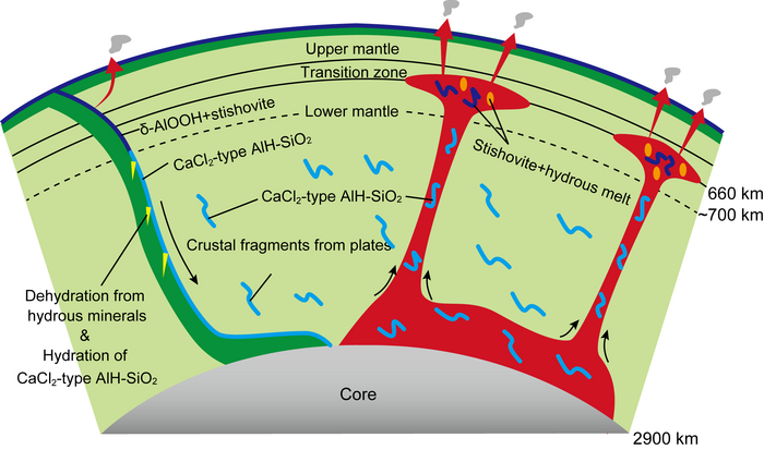 When water is released from minerals, it reacts with rocks to form hydrous magma, which separates from the plate and moves to the surface. Therefore, the depth at which minerals release water is considered to be the upper limit of water transport depth. Therefore, it has been pointed out that in the lower mantle, which is particularly hot, minerals cannot hold water and may not be able to transport water. Contrary to this property, the minerals synthesized in this study have a water content that increases with temperature and can hold large amounts of water even under the hottest plume conditions in the mantle. In addition, water released from other minerals is not separated from the plate, but is re-captured by aluminous silica in the basaltic layer of the plate, allowing water to be transported into the deep mantle without loss of water. Furthermore, the plume can also transport water again from the lower mantle to the upper mantle. Therefore, CaCl2-type aluminous hydrous silica may be the most promising water carrier in the lower mantle. In the transition zone and upper mantle, a reverse phase transition from the CaCl2-type phase to stishovite occurs, and water is thought to be released from silica as water-holding capacity in aluminous silica decreases. The local structures of the mantle discovered so far, such as the seismic low-velocity layer just below the transition zone-lower mantle boundary, plume ponding at the boundary, and the hydrous transition zone, are thought to be explained by the presence of water, and the behavior of aluminous hydrous silica can successfully explain these phenomena.